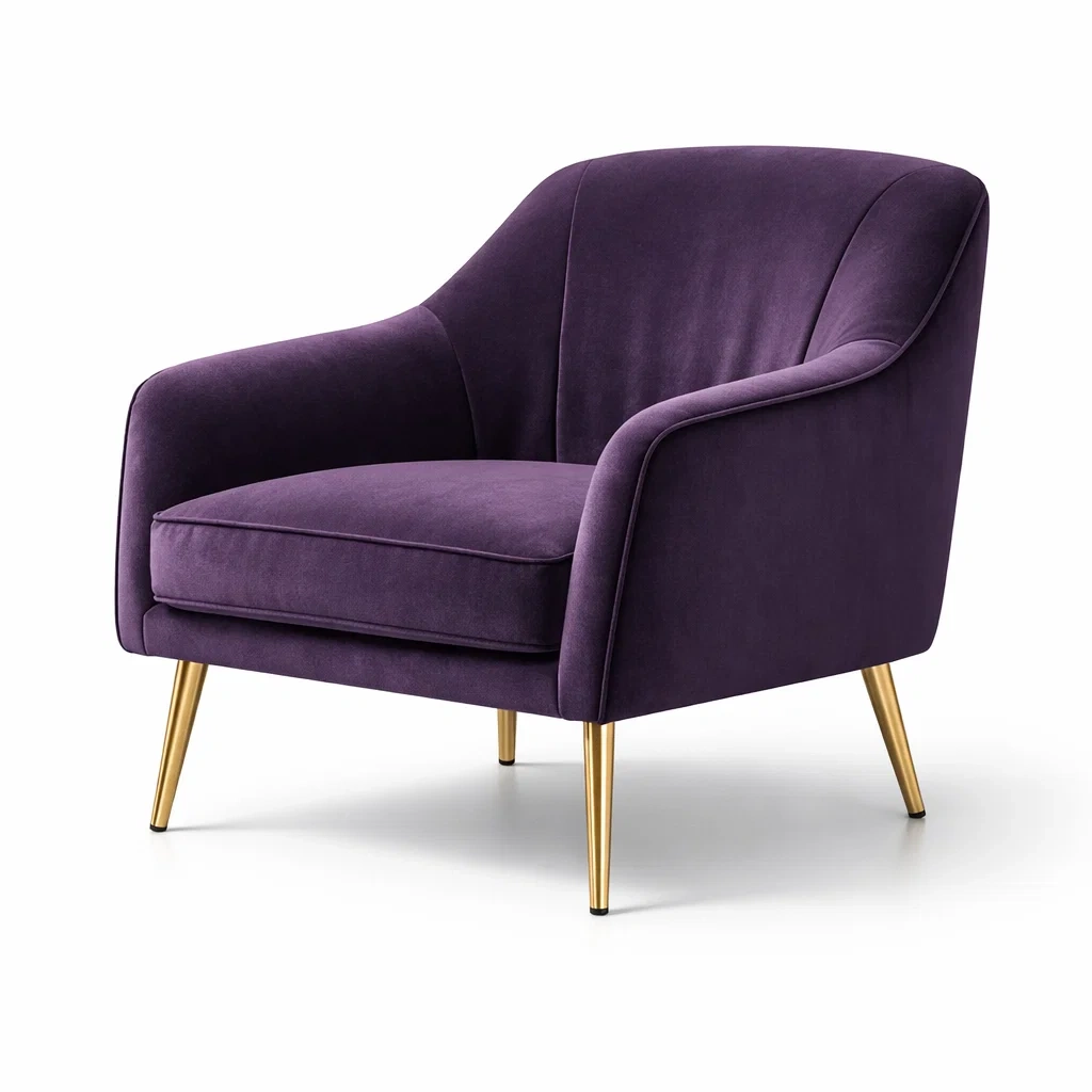 Fauteuil en velours violet avec pieds en métal doré