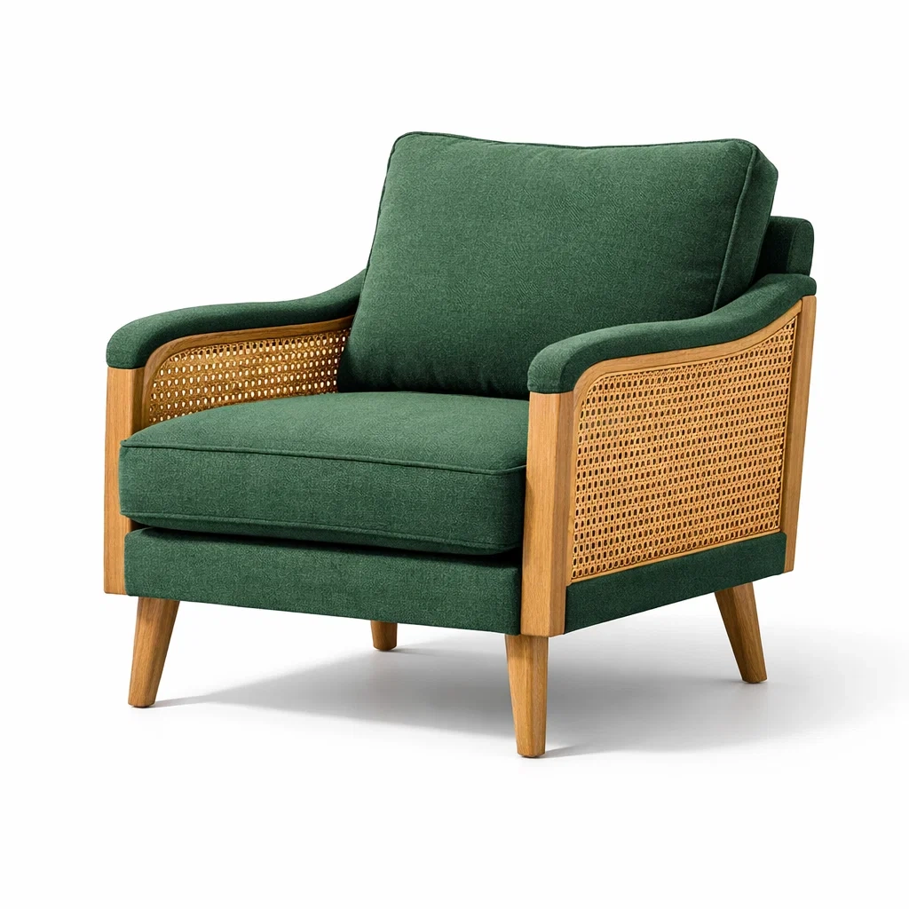 Fauteuil en tissu vert avec bois de hêtre et rotin