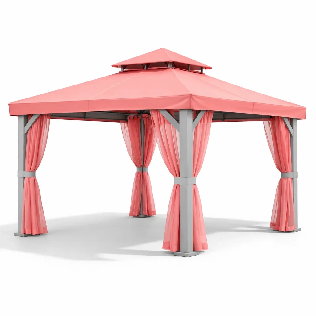 Pavillon de jardin en métal avec rideaux en tissu rose