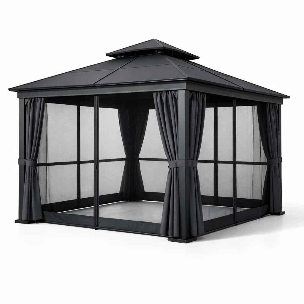 Pavillon de jardin en aluminium noir avec rideaux en polyester