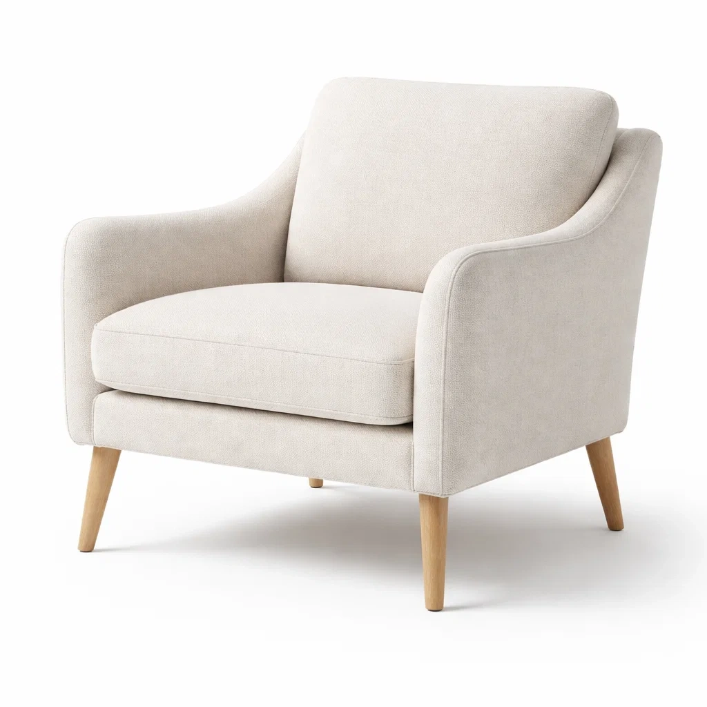 Fauteuil avec revêtement en tissu polyester et pieds en bois de hêtre.