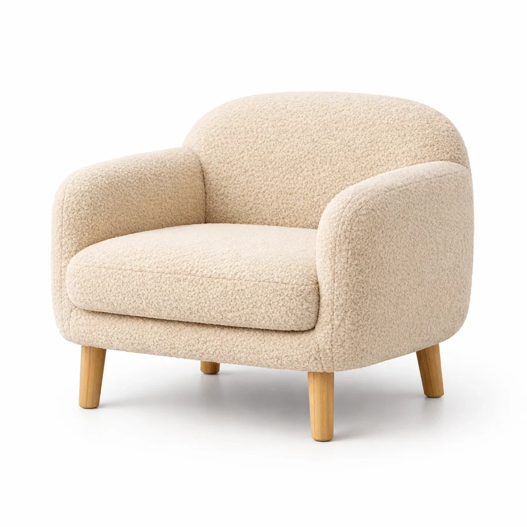 Fauteuil avec structure en bois massif et revêtement en tissu bouclé. Coussin d'assise rembourré en mousse avec accoudoirs arrondis.